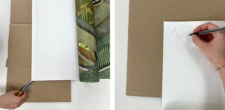 1/ Découper les lés grâce à un cutter et une règle (prendre en compte le raccord et une marge de 10 centimètres)