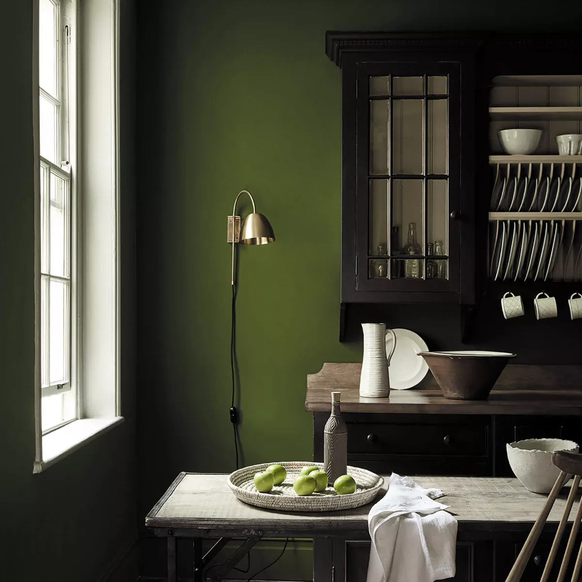 Incontestablement la nuance de vert avec le plus de caractère, le vert kaki séduira petits et grands. Pour une ambiance intimiste, il procurera chaleur, sérénité et apaisement à votre intérieur. Dans votre salon, votre chambre comme dans une salle de bain, cette couleur apportera chic et élégance à votre décoration. Marié à du mobilier en rotin et à des plaids doux aux nuances de gris, le vert kaki ressortira sous son meilleur jour. Choisissez de l'introduire sur un mur entier pour créer un véritable cocon ou combiné à un vert clair en soubassement pour une note moderne.