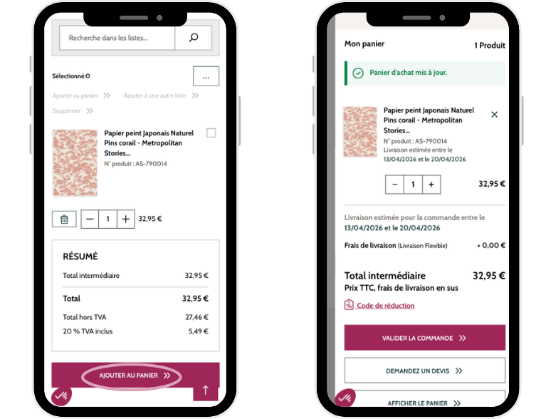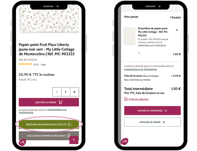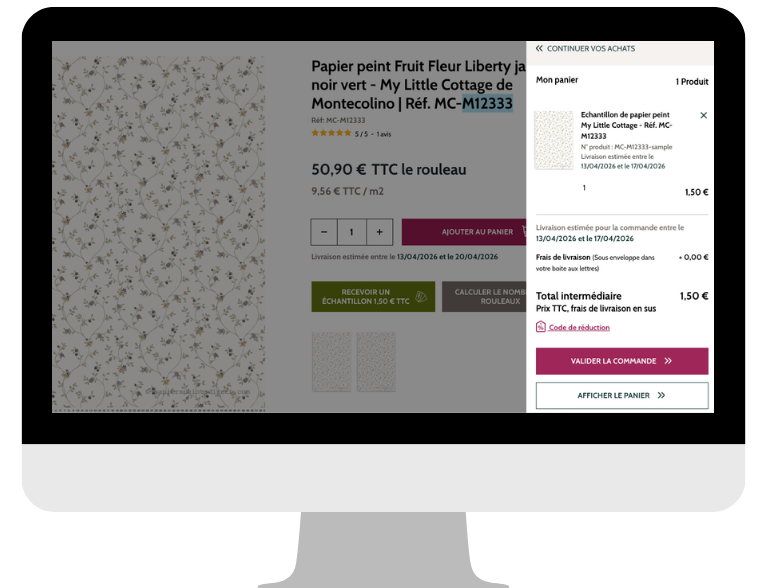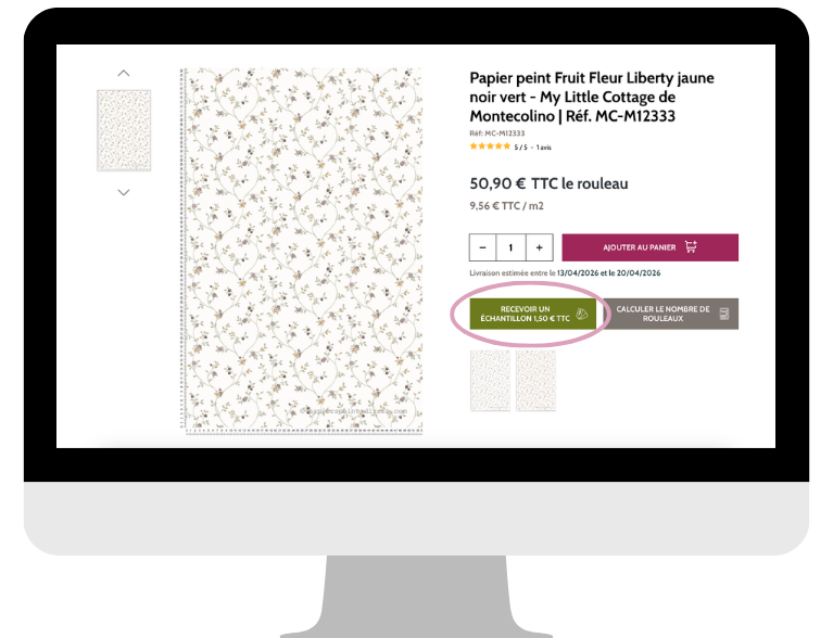 1. Cliquez sur le bouton vert "Recevoir un échantillon - 1,50 € TTC " situé à côté du bouton gris "Calculer le nombre de rouleaux" sur la fiche produit.