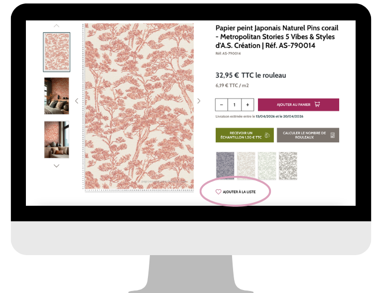 Sur notre site, vous avez la possibilité de créer des listes de favoris. Celles-ci sont particulièrement utiles lorsque vous souhaitez sauvegarder des modèles que vous aimez afin de ne pas les perdre. Ces listes sont sauvegardées sur votre compte, vous pouvez les nommer et y accéder quand vous le souhaitez depuis votre espace client. Par exemple, si vous décorer votre salon, créez une liste de favoris que vous appelerez "Papiers peints Salon".