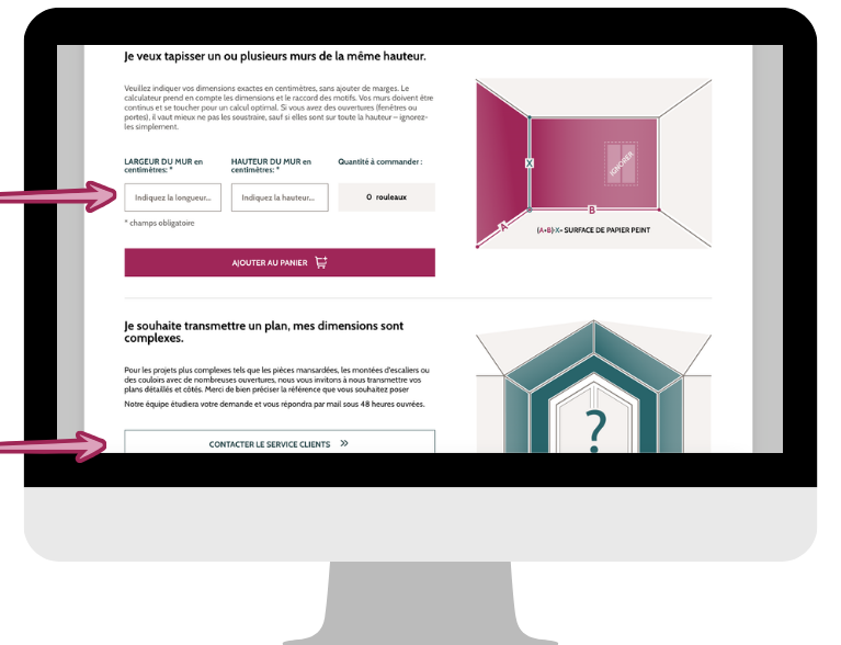 Si vous tapissez les 4 murs d'une pièce, indiquez le périmètre de la pièce en mètres : (longueur en mètres + largeur en mètres) x 2, ainsi que la hauteur des murs en mètres.