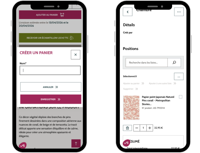 Vous pouvez ensuite modifier facilement votre sélection : tester différents modèles, varier les couleurs ou les motifs, et même comparer plusieurs papiers peints pour une même pièce.