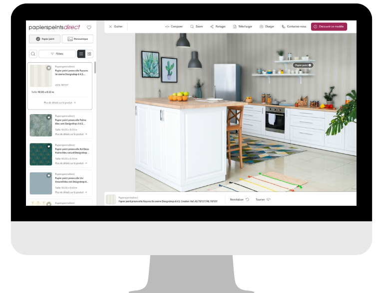 Choisir un papier peint n’est pas toujours évident à partir d’une simple photo produit. C’est pourquoi nous mettons à votre disposition un outil de visualisation avancé, accessible directement depuis la fiche produit.