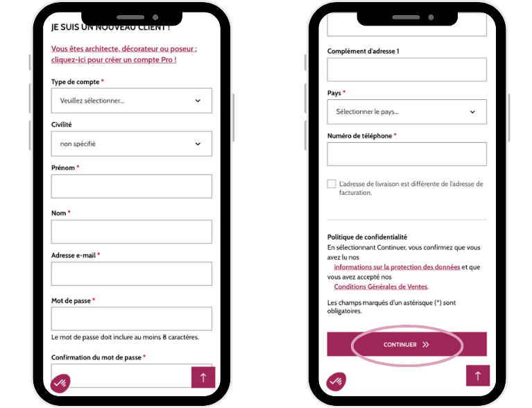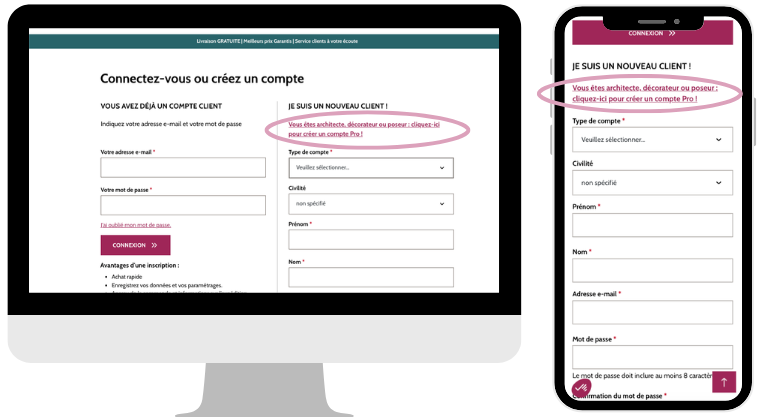 1. Sélectionnez le formulaire pour les comptes professionnels visible avec le lien : "Vous êtes architecte, décorateur ou poseur : cliquez-ici pour créer un compte Pro !"