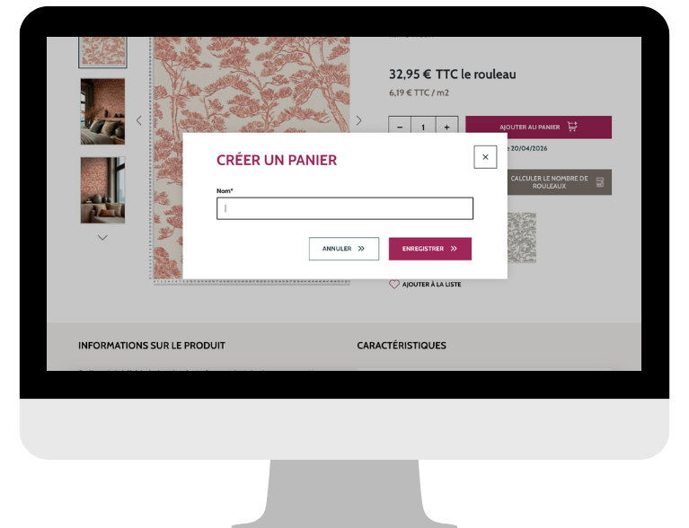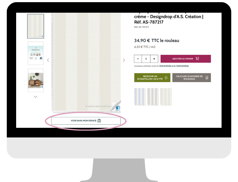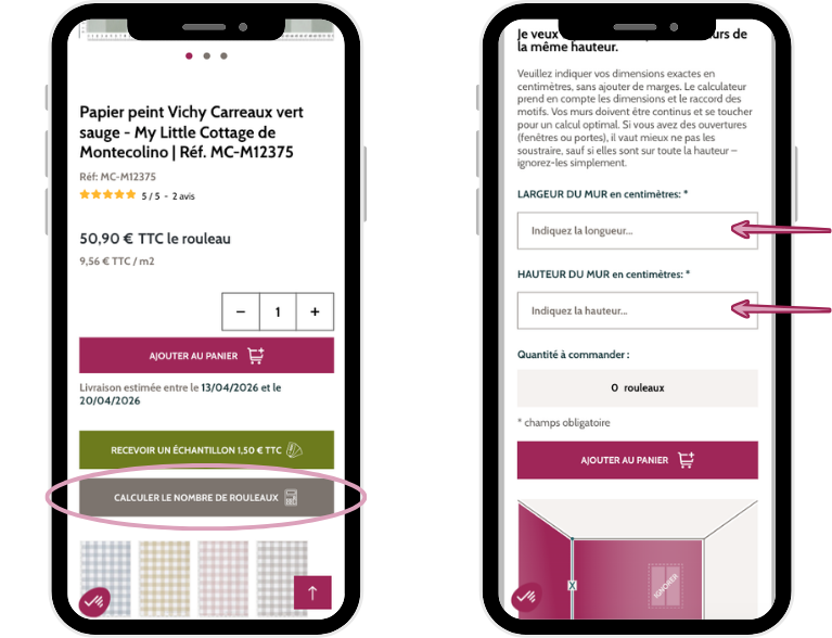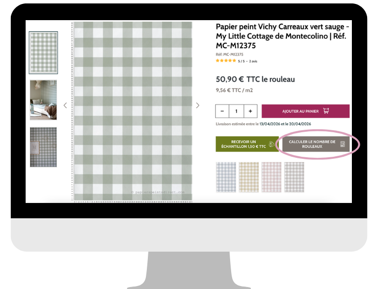 1. Cliquez sur le bouton gris "Calculer le nombre de rouleaux" situé à côté le bouton vert "Recevoir un échantillon" sur la fiche produit.