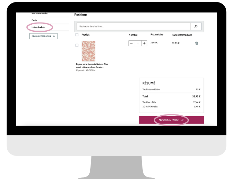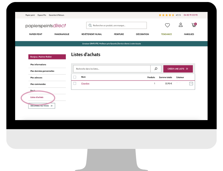 Pour la retrouver plus tard, cliquez sur l'icône en forme de coeur ou sur l'icône Mon compte en forme de personne tout à haut à droite, puis sélectionnez "Listes d'achats". Ainsi, vous retrouverez toutes vos listes et vos modèles préférés.
