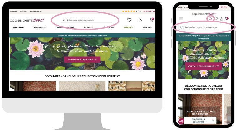 Accessible en haut de chaque page sur ordinateur ou en cliquant sur la loupe sur mobile, notre barre de recherche est très efficace lorsque vous cherchez quelque chose de précis.