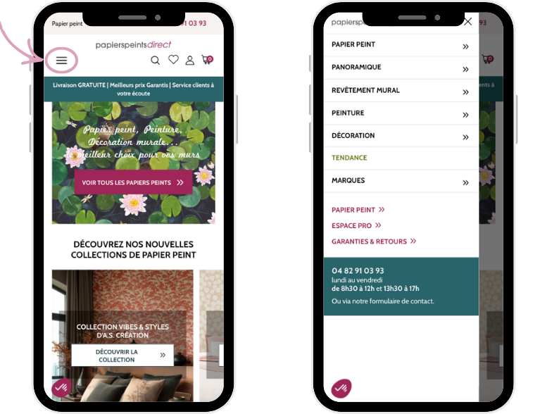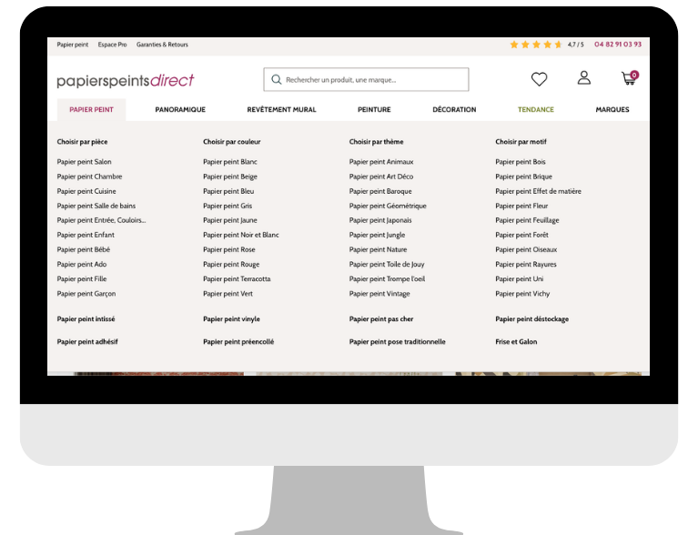 Vous y retrouverez nos catégories de produits : papier peint, panoramiques, peintures et autres accessoires. Vous pourrez directement choisir une sous-catégorie, par exemple, dans la catégorie papier peint, la sous-catégorie papier peint cuisine.